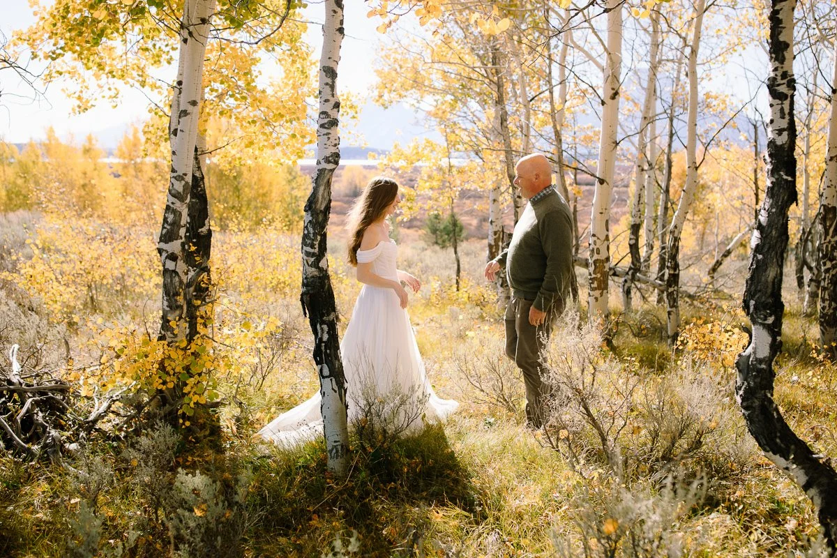 One of the highlights of this part of the day was McKenna’s father-daughter first look. Just outside their rooms, a grove of golden aspen trees created the perfect private setting for this emotional moment. Of all the places we’ve photographed getting-ready moments in the Tetons, this was by far our favorite. The natural light, the quiet seclusion, and the breathtaking scenery made it an unforgettable start to their wedding day.