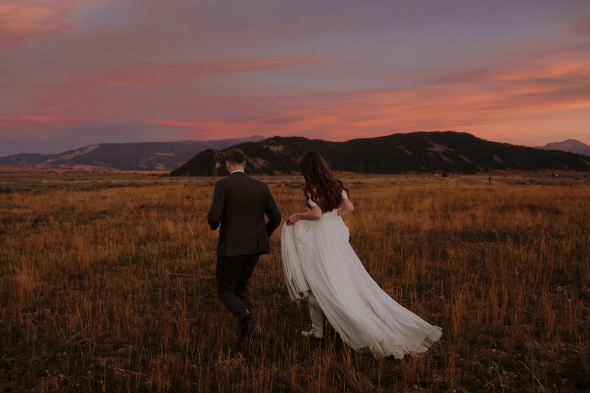 After their heartfelt ceremony, we made our way to Mormon Row for additional portraits. This historic area, with its open fields and iconic barns, provided a stunning contrast to the mountain backdrop. One of our favorite moments from this part of the day was watching them lay in the grass together, simply soaking in the beauty of the moment and the weight of the day.