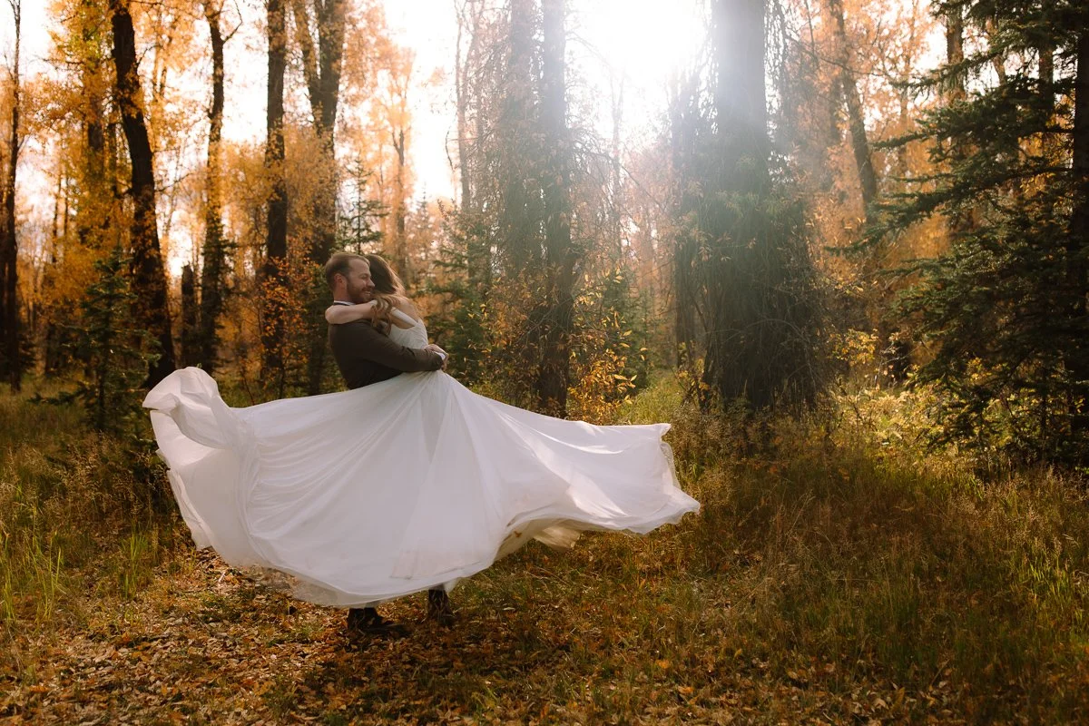 One of our favorite moments of the day was McKenna & Jeremiah’s private vow exchange. We took them to a secluded cottonwood grove—a hidden gem we love to share with our couples. This location, known only to a few, was wrapped in golden leaves and soft grass, creating an incredibly intimate and romantic setting. Here, they exchanged gifts and whispered their promises to one another, surrounded by nature’s autumn splendor.