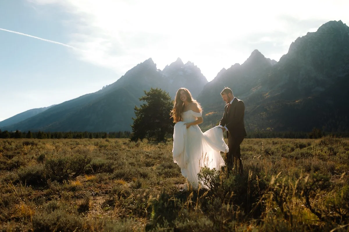 From Jackson Lake Lodge, we made our way to Cathedral Group Turnout for McKenna & Jeremiah’s first look. Since this location sits closer to the mountains, the sun dips behind the peaks earlier, creating a dreamy, faux golden-hour glow. It was an ideal spot for them to see each other for the first time and take in the grandeur of the Tetons before heading into the valley for more portraits.