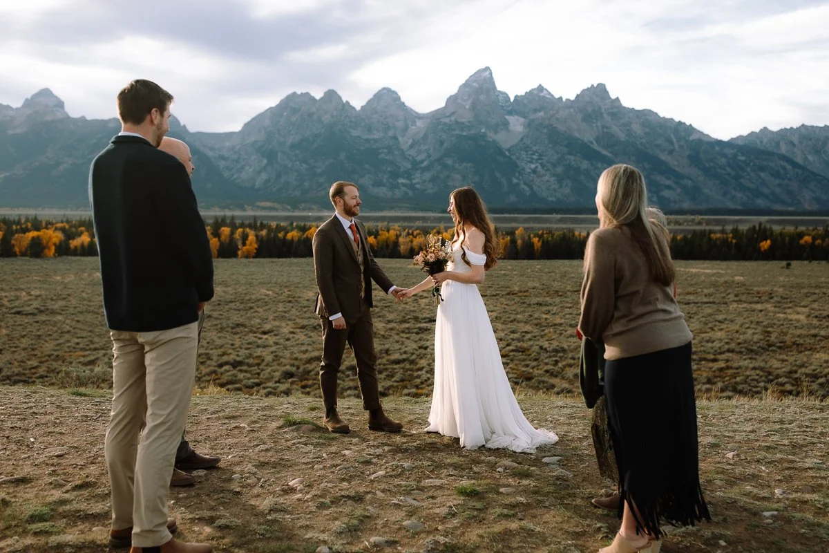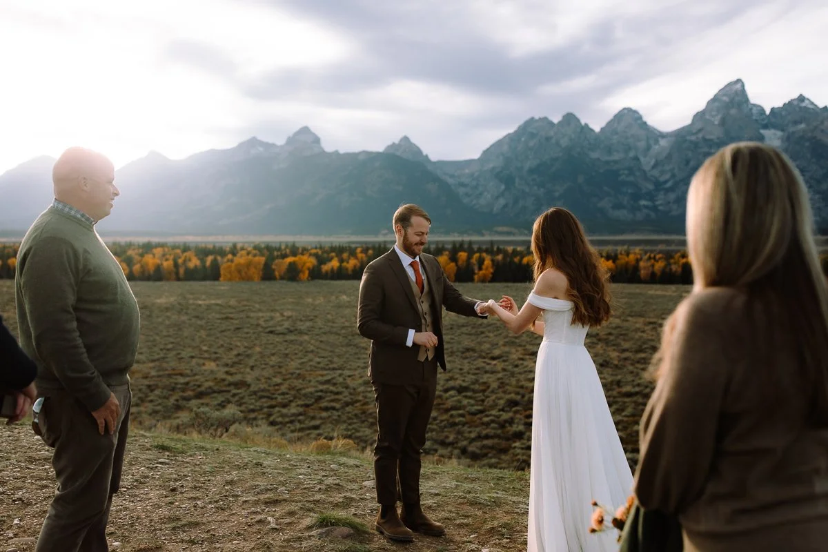 With their family gathered, McKenna & Jeremiah officially tied the knot at Glacier View Turnout. This location, with its panoramic view of the entire Teton Range, offered the perfect ceremony backdrop. As they exchanged rings, the mountains stood tall behind them, a reminder of the grand adventure they were beginning together.