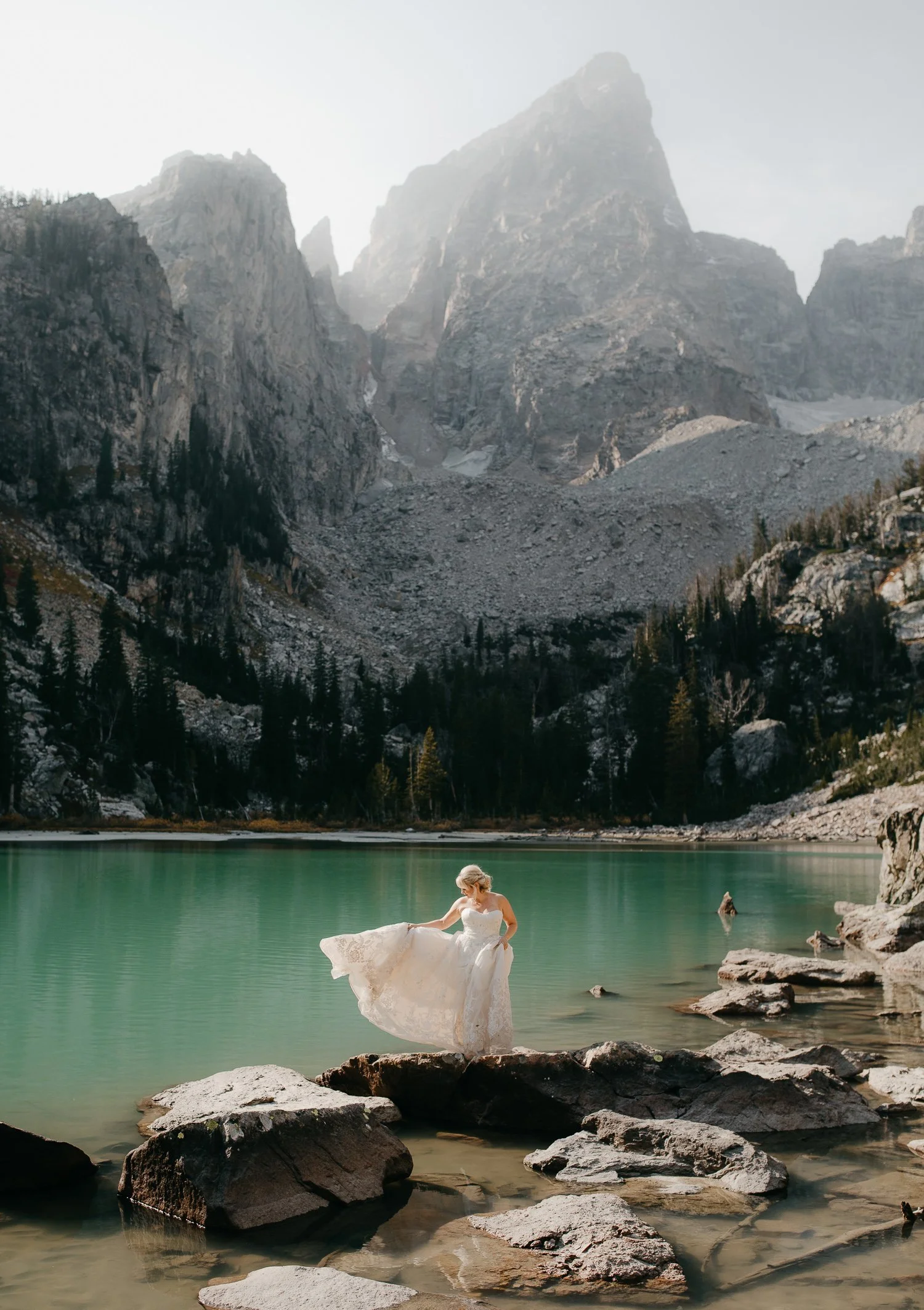 Delta Lake is a stunning alpine lake nestled in the Teton Range, accessible via a challenging hike that takes you through picturesque forests, meadows, and a few boulder fields. The trailhead begins at Lupine Meadows and is just over 9 miles round trip, with an elevation gain of around 2,300 feet. Despite the demanding trek, the breathtaking beauty of Delta Lake and the surrounding mountains make it a popular destination for adventure-seeking couples looking for a unique and memorable elopement location. The milky blue, turquoise lake sit right at the base of the Grand Teton and is fed by the Delta glacier, creating a dramatic and awe-inspiring backdrop for exchanging vows. With towering granite peaks and the sound of rushing water, Delta Lake offers a truly wild and romantic setting for an adventure elopement.