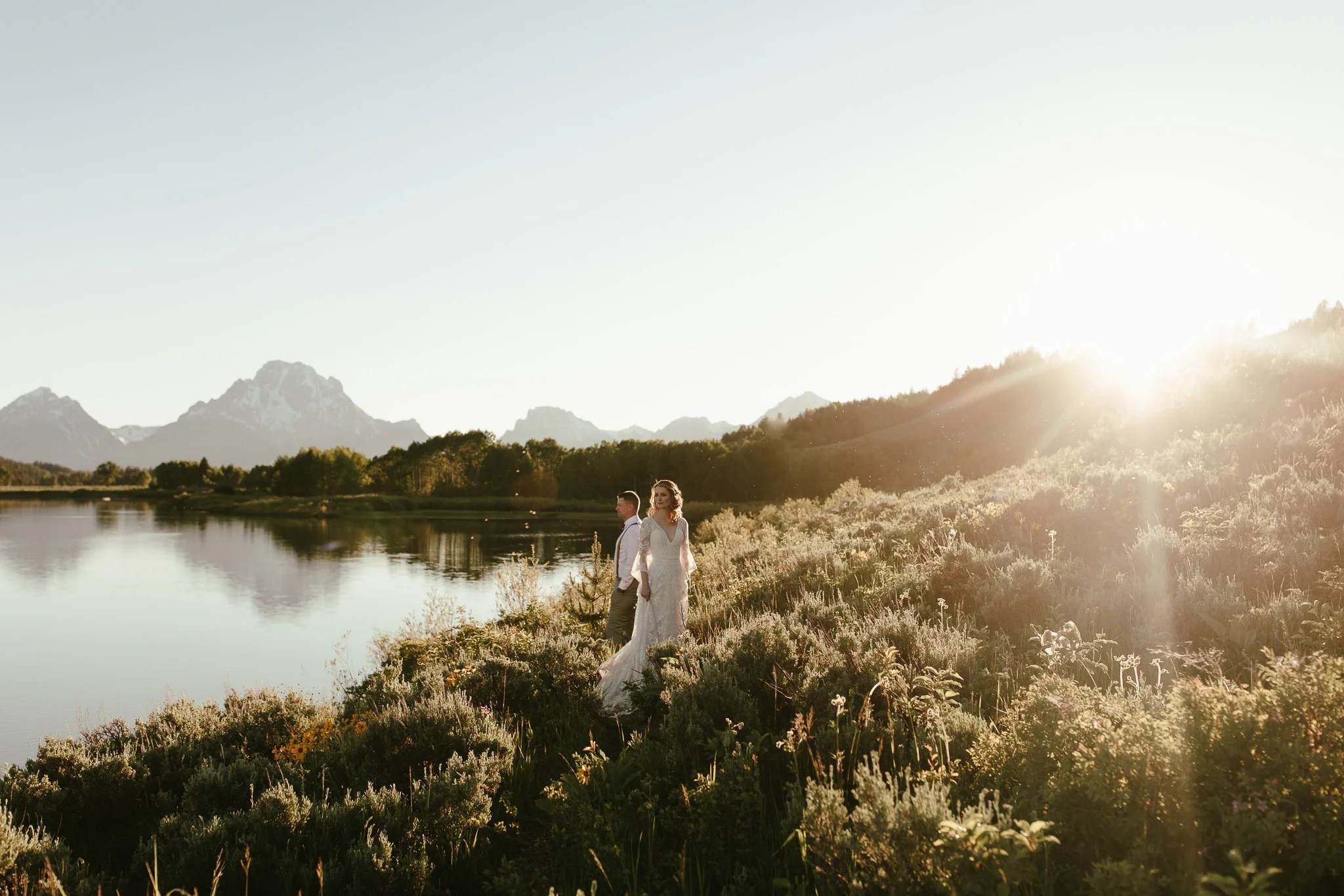 Schwabacher Landing is a picturesque location in Grand Teton National Park that offers a stunning view of the Teton Range reflected in the Snake River. The landing features a serene stretch of water that reflects the beauty of the mountains and provides a peaceful and romantic setting for an elopement or intimate wedding ceremony. The surrounding landscape is breathtaking, with rolling hills, sagebrush, and a variety of wildlife, including moose and beavers. The area is also adorned with wildflowers and cottonwood trees that provide a beautiful backdrop for a wedding. With its natural beauty and peaceful ambiance, Schwabacher Landing is an ideal location for couples looking to exchange vows in a serene and romantic setting.